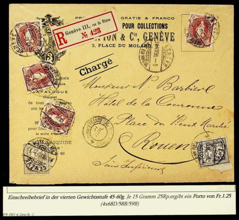 Switzerland 1896 6v on Regd cover from Geneva to Rouen France w/ 3 advertising labels at back (Image)