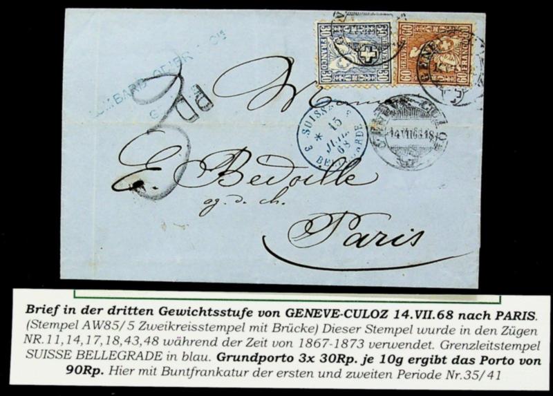 Switzerland 1868 2v on cover w/ "PD" cachet w/ "Geneva-Culoz" cancel to Paris France (Image)