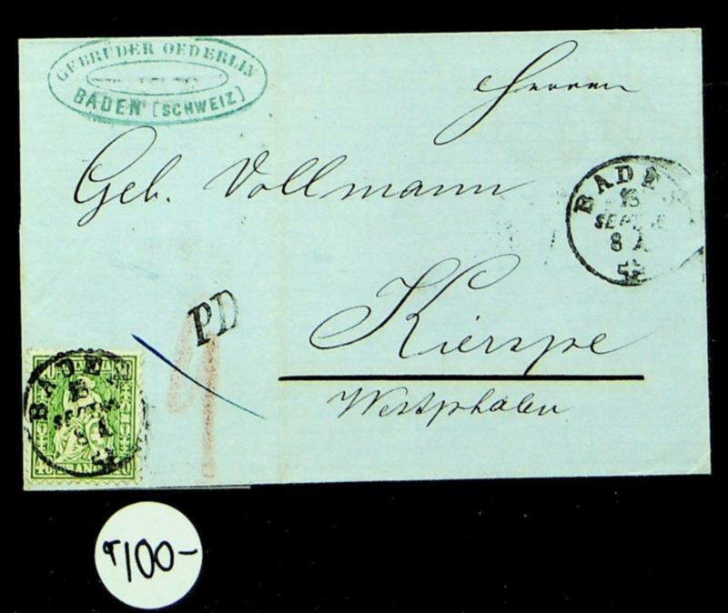 Switzerland 1861 40f on early entire letter Baden to Kierspe Westphalia Germany (Image)