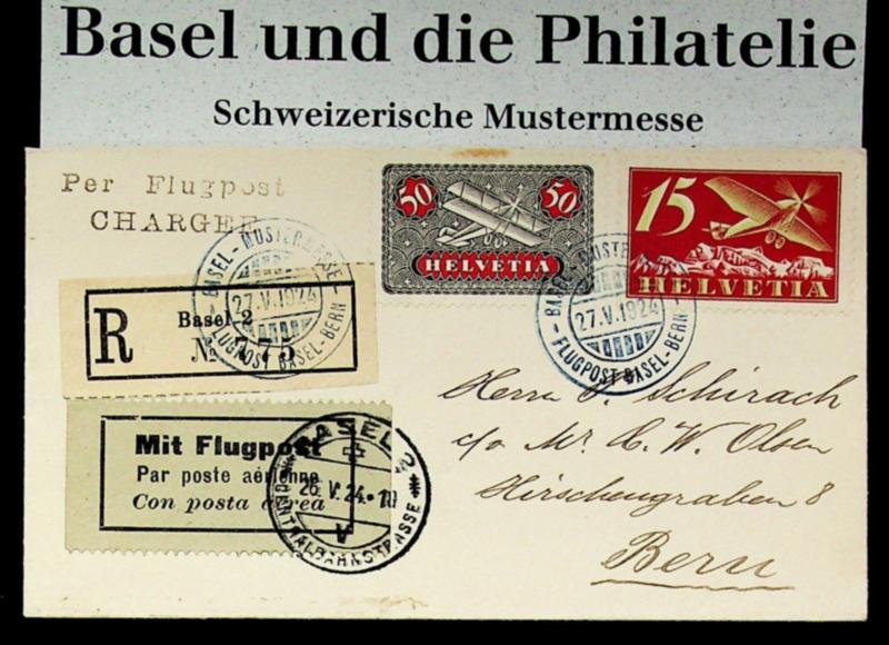 Switzerland 1924 "Schweizer Mustermesse Regd Airmail Basel-Bern" cover w/ 2v (Image)