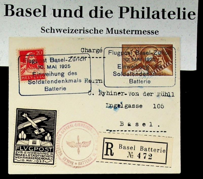 Switzerland 1925 Inauguration of Soldiers Memorial Battery Airmail Basel-Zurich cover w/ 20c+ 35c+ label & returned (Image)