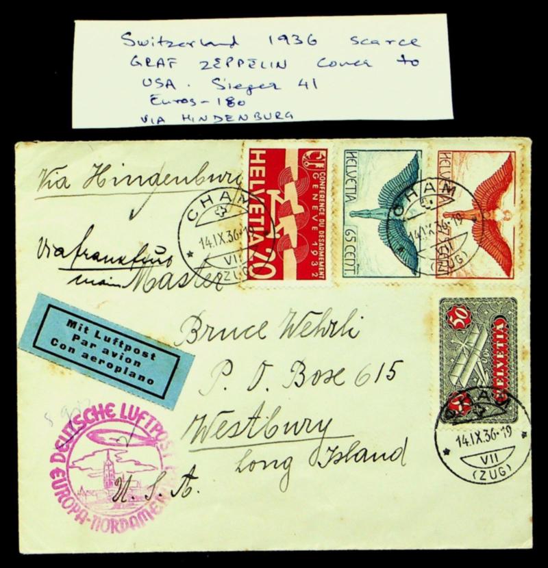 Switzerland 1936 4v on German Airship Graf Zeppelin airmail cover from Cham to USA w/ "Bahnpost" transit pmk at back (Image)