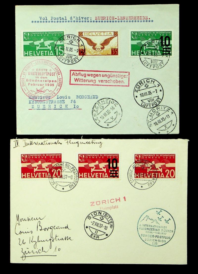 Switzerland 1935-37 first winter airmail/ 4th International Flugmeeting 2 covers w/ 10x2 s/c+ 4v to Zurich (Image)