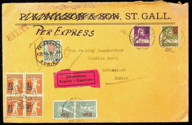 Switzerland 1929 s/c block of 4+ pair+ 2v on Express Taxed cover from St. Gallen to Zurich w/ Postage Due 30c (Image)