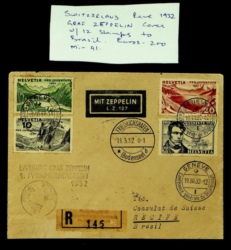 Switzerland 1932 13v franked on back of Regd airmail Graf Zeppelin cover from Geneva via Friedrichshafen Germany to Recife Brazil (Image)