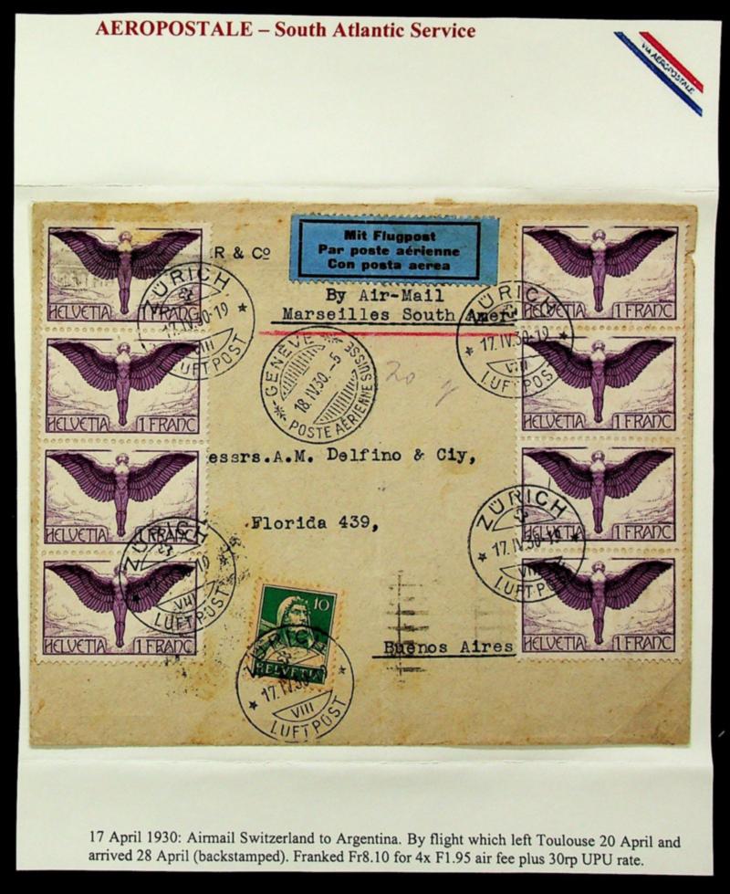 Switzerland 1930 1fx8+ 10c on Aeropostale-South Atlantic Service cover via France to Buenos Aires Argentina (Image)