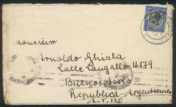 Cover franked with 30c. and sent from MANYONI to Argentina on 24/JA/1933, very rare destination, VF quality! (Image)