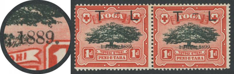 1899 Royal Wedding 'T-L' Overprint on 1d Ovava Tree 2mm hyphen horizontal pair the left-hand unit with Year Error '1889' for '1899' SG 54/54a, small hinge remainders, Cat £295+ for singles. Scarce setenant multiple. (Image1)