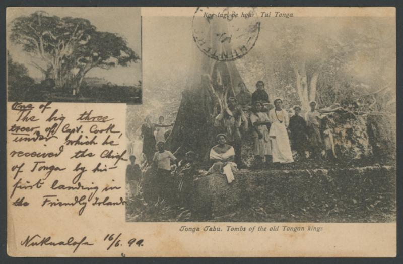 POSTAL HISTORY: 1899 (June 16) social usage of rare 19th century local PPC ('Tombs of the old kings' & a large tree) to NSW with 'NUKULAOFA' cds & Sydney arrival of JY1/99, minor blemishes. The message states that Captain Cook had met the Tongan chiefs below the pictured tree. (Image1)