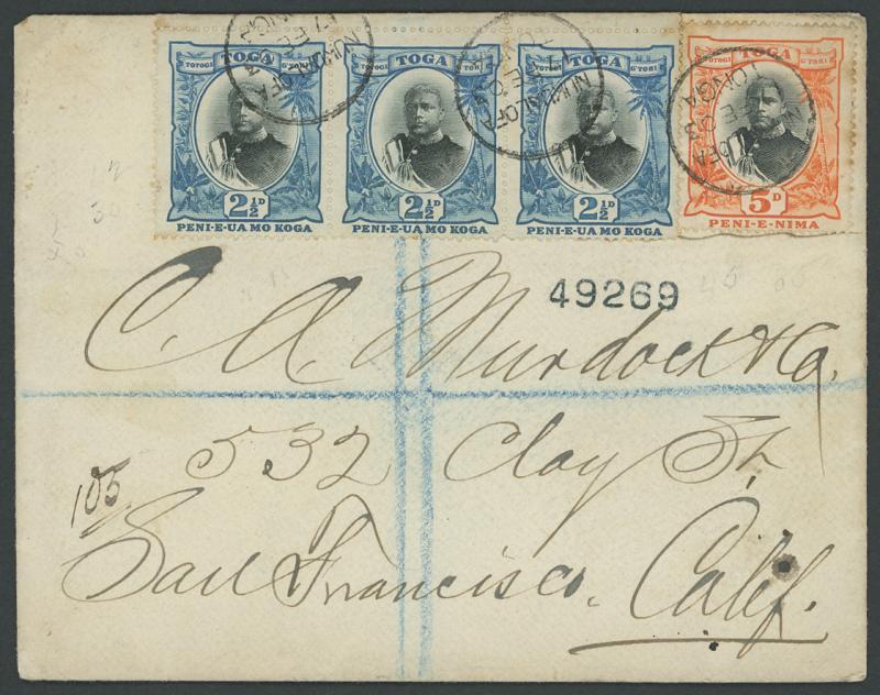 POSTAL HISTORY: 1903 (Feb 17) envelope with Red Cross printed on reverse and 'Dr Maclennan, Medical Dept, Tonga, South Sea' sender's cachet, registered to USA with King George II 2½d x3 & 5d tied by 'NUKUALOFA/TONGA' cds cancels, US '49269' registration number handstamp applied on the face and San Francisco 'MAR/24/1903' arrival backstamp, a couple of minor blemishes. (Image1)
