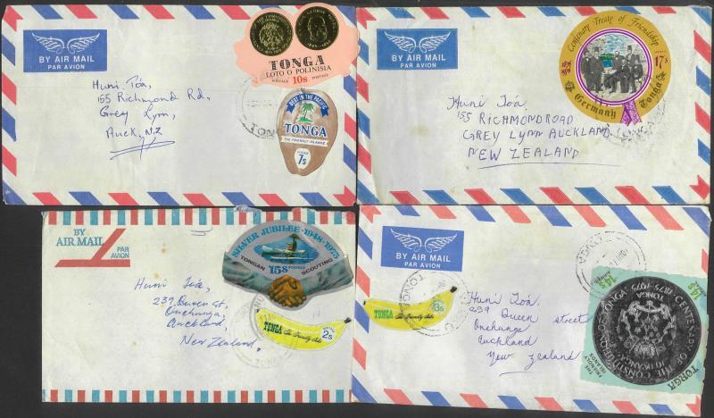 POSTAL HISTORY: 1970s social airmail covers between native Tongans at home & in New Zealand with a marvellous array of self-adhesive die-cut issues, condition very mixed but some are fine.