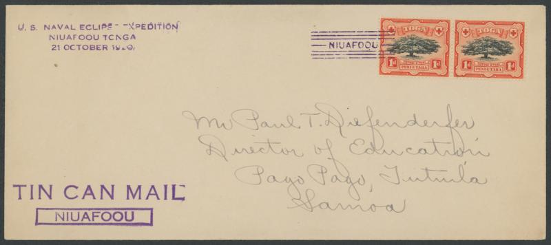 TIN CAN MAIL: Bulging album including 1930 US Naval Eclipse cover, many 1933-39 American cruise ship covers, 1938 'Last Day' cover, 1939 from Fiji, 1941 'Clipper' airmail to New Zealand, 1943 Nukualofa-NZ with '[crown]/PASSED/WW2' censor cachet, 1947 Volcano Evacuation cover with lengthy manuscript cancel, two with 'Inwarb/...' cachet error (one a scarce commercial Australian magazine wrapper), destinations include Burma Kenya Northern Rhodesia and Ulster, some later material including diecut frankings & paquebot cachets, condition variable but many are fine to very fine. An unusually extensive collection.