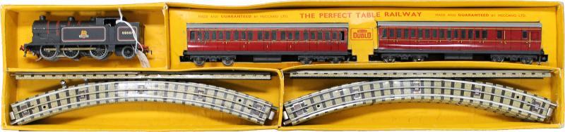 Model Trains Hornby Dublo OO-Gauge 0-6-2 Tank Passenger Train Set, including black tank Locomotive No. '69567', two Brake Coaches, eight curved & two straight tracks in original box in excellent condition. (Image1)