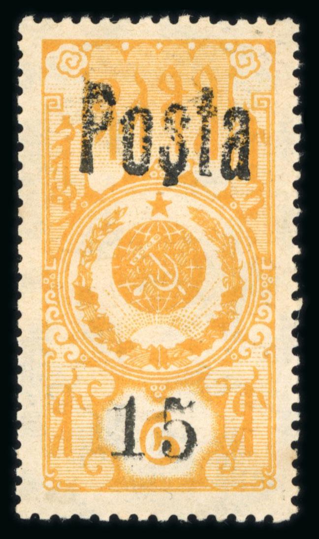 1933 Tannu-Tuwa, 15 k overprint on 6 k orange (Michel 39I, overprint 5.1 mm), a well-centered and scarce stamp. The seller notes the following “The rare original surcharge made by the first numbering machine; not listed separately in Michel”. (Image)