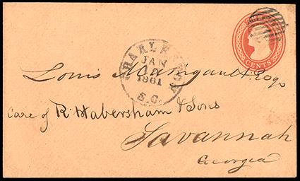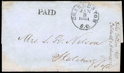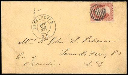 A SCARCE AND DESIRABLE "KEY DATE" CONFEDERATE COVER - USED ON THE DAY SOUTH CAROLINA VOTED TO SECEDE FROM THE UNION. US$1,000-1,500 (Image)