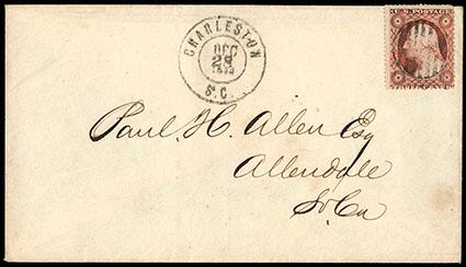 Symbol:Confederacy, Charleston, S.C. Dec. 28, 1860. Double circle postmark on cover to Allendale, S.C., franked with United States 1857, 3¢ dull red Dull Red (26, perf. flaws at top) with central struck grid cancel, blind embossed corner card for Charleston merchant on backflap, Very Fine, attractive independent State usage. Estimate; $150 - 200.