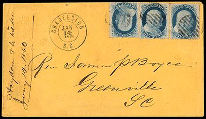 Symbol:Confederacy, Charleston S.C., Jan. 14, 1861. Well-struck double-circle datestamp on buff cover to Greenville S.C. with colorless embossed company shield-style corner card at upper left, franked with three United States 1¢ Blue, Ty. V (24) tied by grid cancels, incorrectly docketed 1860 at left, Very Fine and rare Independent State usage,ex-Calhoun. Estimate; $300 - 400. US$300-400 (Image)