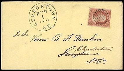 Symbol:Confederacy, Georgetown, S.C., Feb 1, 1861. Clear strike of cds and bearing U.S. 3¢ dull red (26) canceled by matching sharp circular grid on yellow cover to Georgetown S.C. and forwarded to Charleston; small edge tear at top, otherwise Very Fine, an attractive Independent State usage,ex-Teal. Estimate; $100 - 150. US$100-150 (Image)