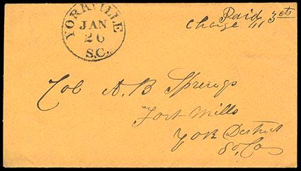 Symbol:Confederacy, Yorkville, S.C. Jan 26 (1861). Bold cds with manuscript "Pd 3cts/ Charge (box) 111" on cover to "Col. A B. Springs, Fort Mills, York District, So. Ca.", Very Fine and attractive. Estimate; $150 - 200.