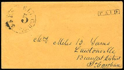 Confederacy, Barnwell Court House, S.C., 1861, 5¢ black. Provisional handstamp with large "5" in center with boxed "Paid" straight line on cover to Lawton, S.C.; attractive and impressive, Very Fine, Only two recorded examples in the Crown census, but seven total now recorded in recent years. Scott No. 123XU1; $3,000.