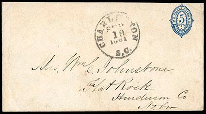 Confederacy, Charleston, S.C., 1861, 5¢ blue. Entire canceled by "Charleston, S.C., Sep. 19, 1861" cds to Flat Rock, N.C., flap missing & bit reduced at top, Very Fine, a lovely example of this Postmasters' Provisional entire. Scott No. 16XU1; $1,750. US$0 (Image)