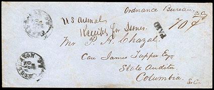 Symbol:Confederacy, Charleston, S.C., Jan 20. Two strikes of cds on legal size linen lined cover to the State Auditor in Columbia, S.C., with matching "Paid" handstamp and manuscript "70¢" rate, manuscript Ordinance Bureau, So. Ca. endorsement and "U.S. Arsenal, Receipt for Issues." docketing, Very Fine, the only known 70¢ rating from Charleston. Estimate; $300 - 400.