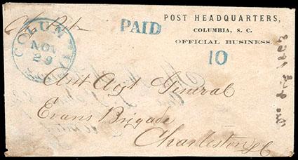 Symbol:Confederacy, Columbia, S.C. Nov 29. Blue cds on turned semi-official cover with imprint "Post Headquarters, Columbia, S.C., Official Business" with matching blue "PAID" and "10" handstamps, cover addressed to Asst. Adjt. General, Evans Brigade, Charleston, S.C., second usage of this turned cover franked with 1963-64 10¢ blue (11) tied by a Charleston, S.C. Nov 21 cds and addressed to Sumter, S.C., docketed "Dec 4th 1863", Very Fine,ex-Karrer. Estimate; $400 - 600.