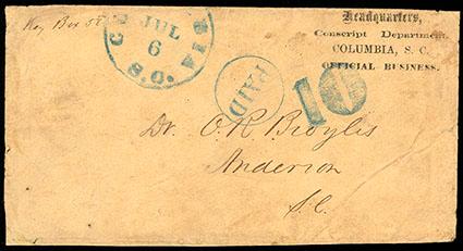 Symbol:Confederacy, Columbia S.C., Jul 6. 32mm cds with matching "Paid" in circle and large "10" rate on printed semi-official envelope to Anderson, S.C., printed "Headquarters, Conscript Department Columbia, S.C. Official Business" at upper right, light wear and ageing, F.-V.F., a scarce Official cover,ex-Malpass, Oswald. Estimate; $200 - 300. US$200-300 (Image)