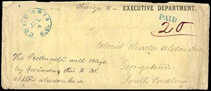 Confederacy, Columbia, S.C., Jul 4. Blue cds with matching "Paid" handstamp and magenta manuscript "20" rate on legal size cover to Col. Alston in Georgetown, S.C., with printed "Executive Department" imprint and manuscript "Charge to-" endorsement at left, postmaster forwarding instruction; cover wear and small tears, Fine. C.S.A. Catalog No. S-SC-01; Estimate $200 - 300. US$200-300 (Image)