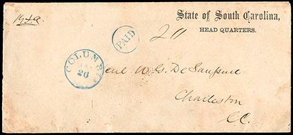 Confederacy, Columbia, S.C., Jan 26. Blue cds with matching "Paid" in circle handstamp and manuscript "20" rate, on legal size cover to Charleston, S.C., with "State of South Carolina, Head Quarters." imprint at upper right; some light wear and small corner repair, F.-V.F. C.S.A. Catalog No. S-SC-16; Estimate $200 - 300. US$200-300 (Image)