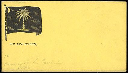 Symbol:Confederacy, South Carolina Palmetto Flag. Two unused South Carolina Palmetto Flag patriotic covers, first is "We are Seven" verse below on unused lemon colored cover, second unused patriotic showing Palmetto flag in black with verse below, Very Fine. Estimate; $75 - 100. US$75-100 (Image)