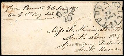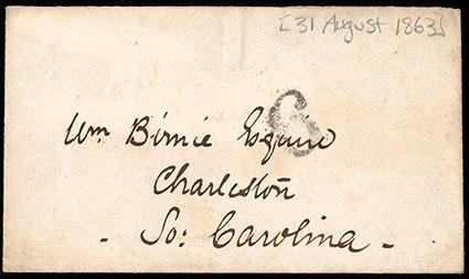 A RARE INCOMING BLOCKADE-RUN COVER TO CHARLESTON S.C. WITH A BOLD IN-PORT RATE MARKING. US$1,000-1,500 (Image)