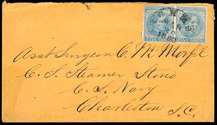 Symbol:Confederacy, (Naval) C.S. Steamer Stono. Orange buff cover bearing 1862 5¢ blue (7) pair, large margins, tied by "Richmond Va., Mar. 30 1863" cds addressed to "Asst. Surgeon C. H. Morfit, C.S. Steamer Stono, C.S. Navy, Charleston S.C.", docketed "Recd Apl 1st 1863, E. Am" on reverse, Very Fine and rare Confederate naval cover. Estimate; $400 - 600.