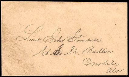 Symbol:Confederacy, (Naval) Naval Addressed Covers. Two covers; one a hand carried cover addressed to "Lieut. John Grimball, C.S. Str. Baltic, Mobile, Ala.", other addressed to "Mr. F.A. Smythe, C.S. St. P(almetto) State, Charleston, S.C." on cover with Richmond, Va. cds (stamp missing), Fine. Estimate; $200 - 300.