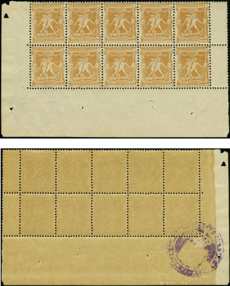 1 l. in marginal block of 10 with negative Corfu "TAMEION" treasury seal on reverse, very fine and scarce