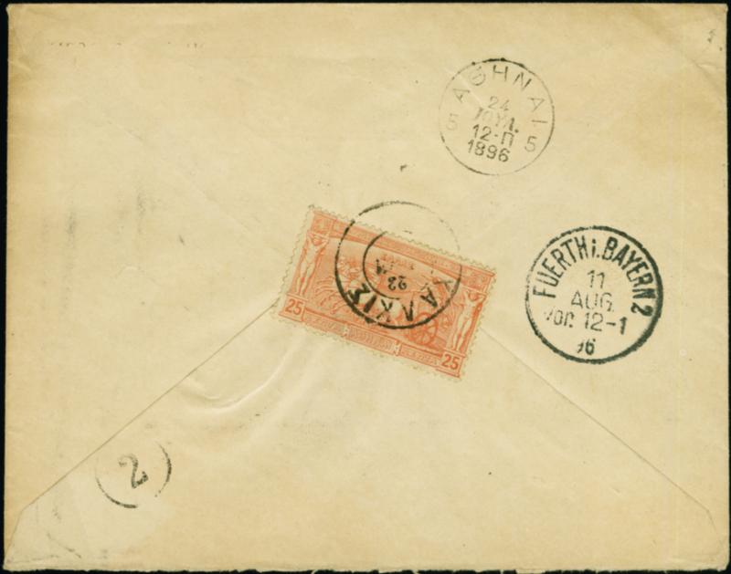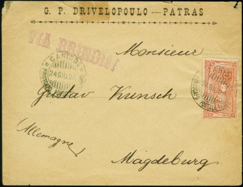 "CARIDDI*PIROSCAFO POSTALE ITALIANO 24 GIU 96" on 25 l. with additional strike alongside, on commercial cover to Germany, with arrival mark. Slight opening faults, still fine and scarce.
