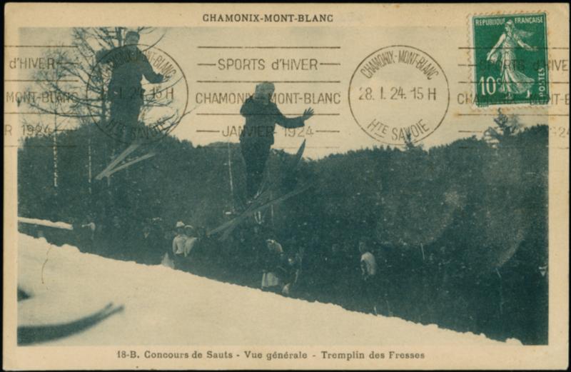 1924, "SPORTS d'HIVER CHAMONIX MONT BLANC JANVIER 1924/ 28.I.24" (4th day of the Games), machine cancel on picture side of picture postcard ‘Ski jumper’, very fine and rare