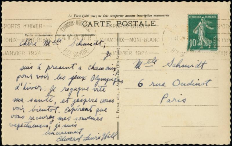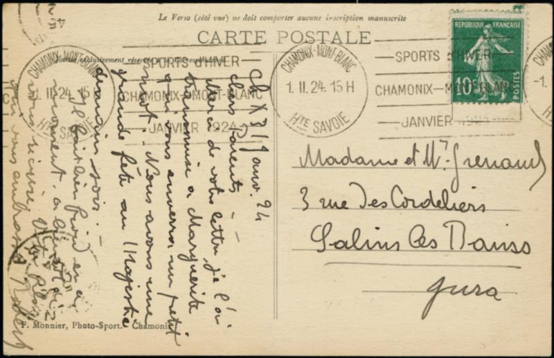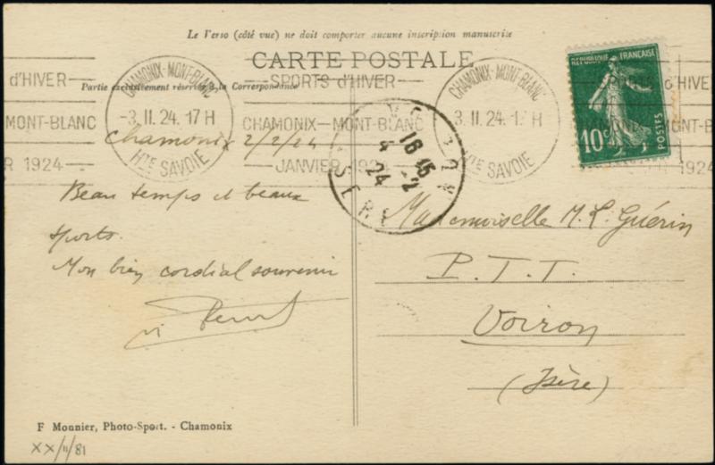 1924, "SPORTS d'HIVER CHAMONIX MONT BLANC JANVIER 1924/ 4.II.24" (Last but one day of the Games), machine cancel on postcard to Paris, very fine and scarce