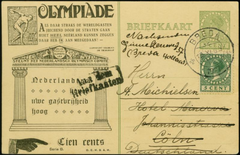 Huygens cards: Serie B: postcard 5 c. with text printed in black and without series number, used from "BREDA 19.XI.1928" to Cologne and re-directed to Breda. A very rare card (Geuzendam OL17)