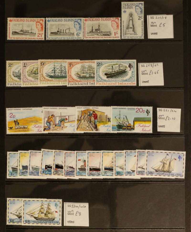 Thematics Q.E.II COMMONWEALTH SHIPS Commem. & Defin. mint on album pages; FALKLAND ISLANDS 1964/2014 various Commem. & Defin sets (14) & 3 MS. incl 1993 Tourism, 2005 Maritime Heritage, 2014 Battle of Falklands x 2, 1999 Gold Rush MS etc, MALTA 2012 70th Anniversary of Operation Pedestal, set of 99 values in 11 sheetlets of 9 stamps plus one label, SG1734/1821, SAINT HELENA 1984/2005 selection of 9 sets & 2 MS, incl 1988 Bicentenary, 1996 & 1998 Mail Ships, 2001 Royal Navy, 2004 Merchant Ships, 2005 Battle of Trafalgar MS, TRISTAN DA CUNHA 1965/2005 selection of 12 sets & one MS, 1965 Defin. set, 1991 Royal Navy, 1994 Defin. set, 1998 Lobster Survey & MS, 2001 Royal Navy, 2003 Royal Navy x 2, 2004 Merchant Ships, 2005 Battle of Trafalgar, etc, Mainly fine mint unmtd., Total Cat. for all four countries approx. £ 690 (Ref: 252/85) (Image)