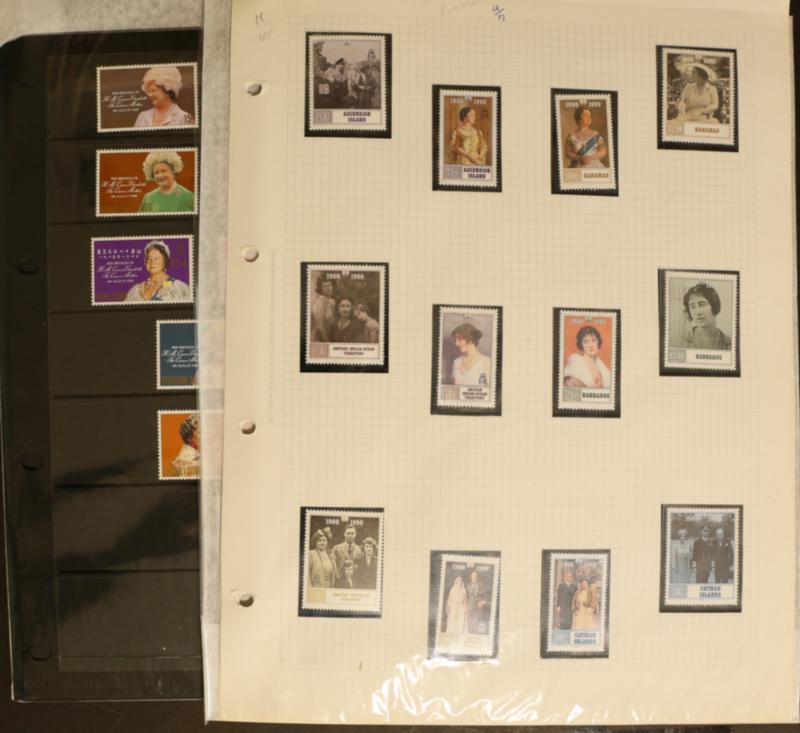 Thematics COMMONWEALTH ROYALTY 1980 Queen Mother Birthday OMNIBUS mint unmtd. coll. with various sets plus Bermuda, St.Helena, Tristan, Pitcairn, Ascension, Solomons, Samoa, Gibraltar, Gambia, Caymans, in sheetlets of 9, also duplicated lower marginal blocks of 6, etc, fine (163 stamps in total) and 1990 Queen Mother’s Birthday 19 different OMNIBUS sets, countries incl Ascension, BIOT, BAT, Falkland Is, Pitcairn, etc, plus a few odds, fine mint unmtd. (44) (Ref: 252/75) (Image)