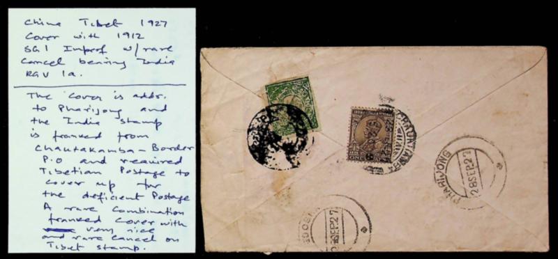 India 1938 KGV ½a+ Tibet SG1 Imperf Postage Due on cover from Chaukhamba Border PO to Pharijong Tibet China (Image)