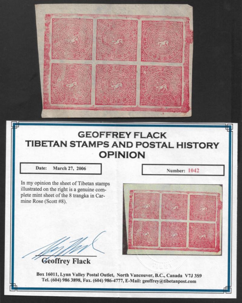 Tibet 8tr complete unused sheet of 6 stamps, in carmine rose, Scott #8, with Certificate - rarely seen! (Image)