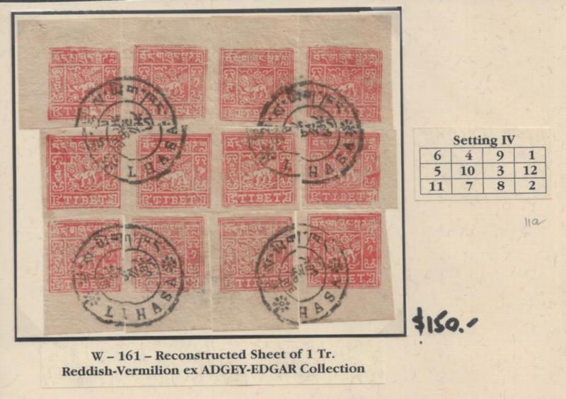 Tibet 1932 1tr Exceptional used Reconstructed Sheet of 12, Setting IV, Reddish-Vermilion shade, Ex. ADGEY-EDGAR Collection (Image)