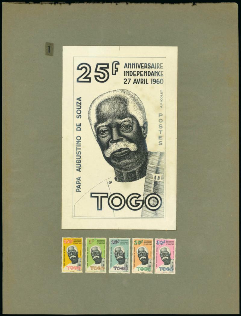1960 25f Augustino de Souza original artwork for the stamp made by Mr Pradhan who worked at De La Rue, London. This artwork was developed in the preparation process for the Togo postage stamp, and beside it is the issued set of five values with light blue SPECIMEN overprint. Unique production elements for the Togolese stamps. (Image)