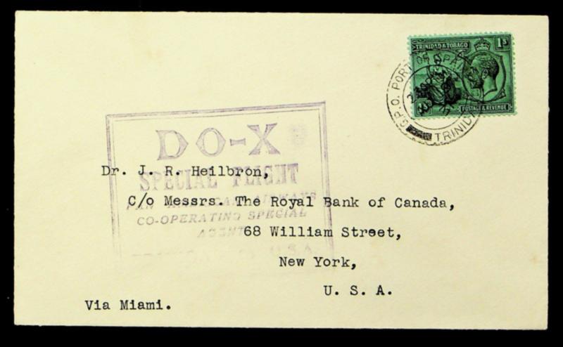 Trinidad & Tobago 1931 1sh on Pan-American Airways Special Flight DO-X cover from Port of Spain vai Miami to New York USA (Image)