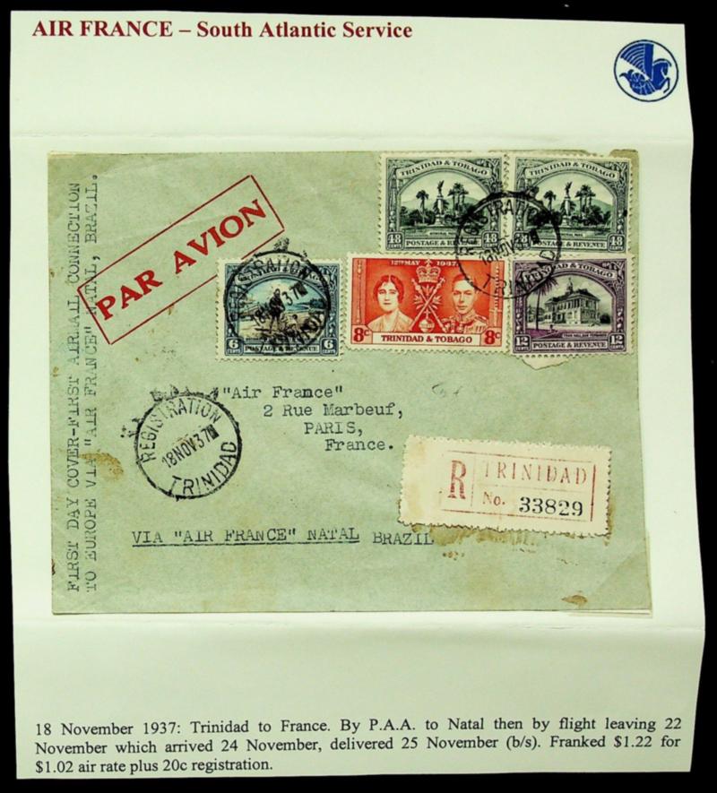 Trinidad & Tobago 1937 5v on Air France-South Atlantic Service airmail Regd FFC via Natal South Africa to Paris France (Image)