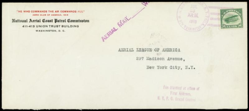 Airmail, 1918, 16¢ green. Tied by purple "Air Mail Service, Wash. N.Y., Phila., Washington, Jul 13, 1918" duplex on legal-size National Aerial Coast Patrol Commission imprint cover to New York City, purple "Aerial Mail." straightline cachet, held for May 15th flight, New York (7.15) arrival backstamp, Very Fine. Scott No. C2; $800. US$0 (Image)