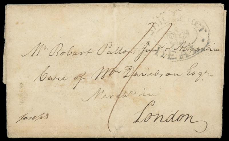 Symbol:1814 (May 16) Alexandria Va. Blockade Run to London, England. Folded letter datelined "Alexandria 16 May 1814", carried through the Chesapeake Bay blockade, arrived in Deal, England with "Ship Letter, Deal" crown double-oval handstamp, manuscript "1/-" shilling due (4p ship fee plus 8p to London), London (7.21) arrival backstamp; edge wear, Very Fine War of 1812 blockade-run cover. Estimate; $750 - 1,000.