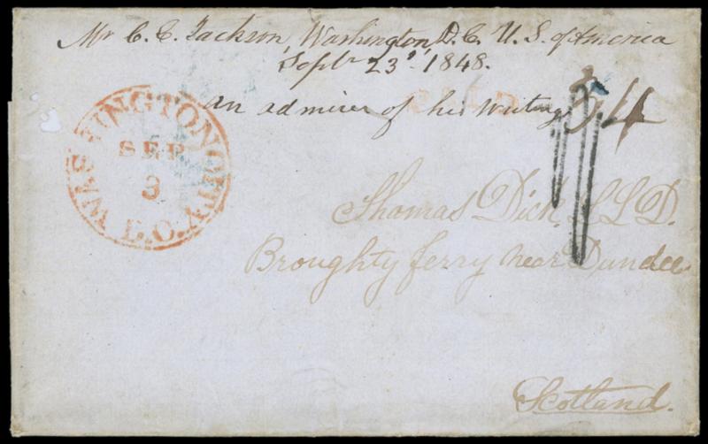 Symbol:(Retaliatory Rate) 1848 (Sep. 3) Washington D.C. to Broughty Ferry, Scotland. Red cds on gray 1848 folded letter with red "Washington D.C. Sep 3" cds and "Paid" handstamp with ms. "34" cents rating, carried by Cunard Line Britania from Boston Sep. 6th to Liverpool arriving Sep. 20th, Liverpool America (9.20) backstamp with matching "1/-" due rating handstamp; bit of erosion, F.-V.F. and scarce retaliatory use from Washington D.C. Estimate; $200 - 300. US$200-300 (Image)